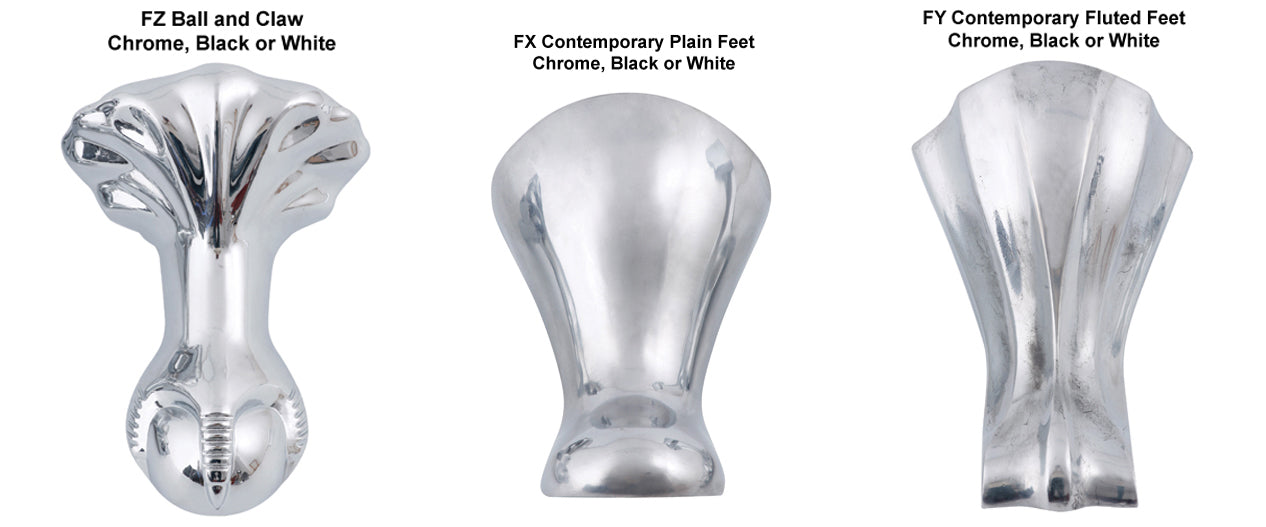 - Three bath foot options, Ball and Claw, Contemporary Fluted and Contemporary Plain all available in chrome, black or white. Also available in nickel or brushed nickel - enquire for details.