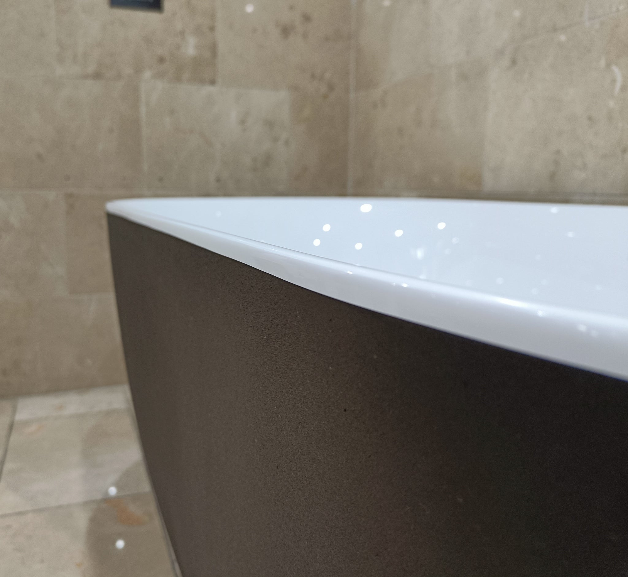When we paint a traditional roll top bath we paint right up to the edge of the roll on the outside of the bath leaving the rolled top edge and the interior of the bath unpainted. When we paint a contemporary style of bath with no roll we expertly mask a line just a few mm's down from the top edge on the outside of the bath and paint to that. This creates a high contrast between your chosen paint colour and the white of the bath accentuating the paint colour with the sharp contrast that the edge to the white of the bath provides.